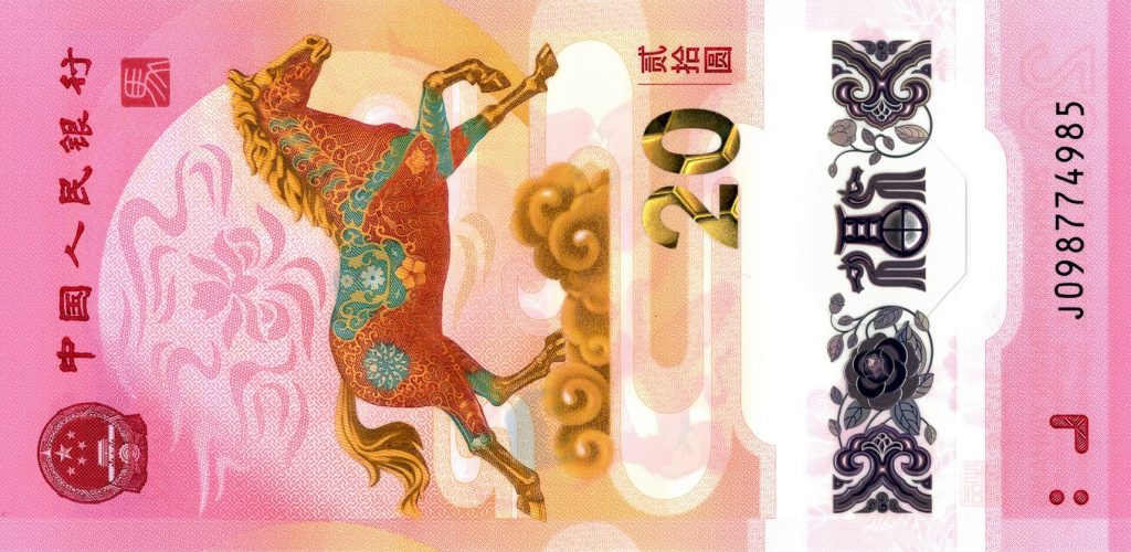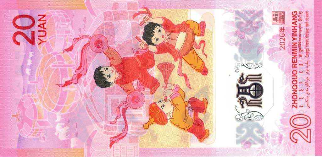 The front side, arranged vertically, features Chinese text alongside the National Emblem of the People’s Republic of China, reinforcing state authority and national continuity. Dominating the composition is a horse, a traditional Chinese symbol of vitality, progress, perseverance, and good fortune. The denomination “20” is rendered using SPARK Optical technology, an advanced optically variable feature that produces dynamic color-shifting effects when the note is tilted, enhancing both security and visual sophistication.