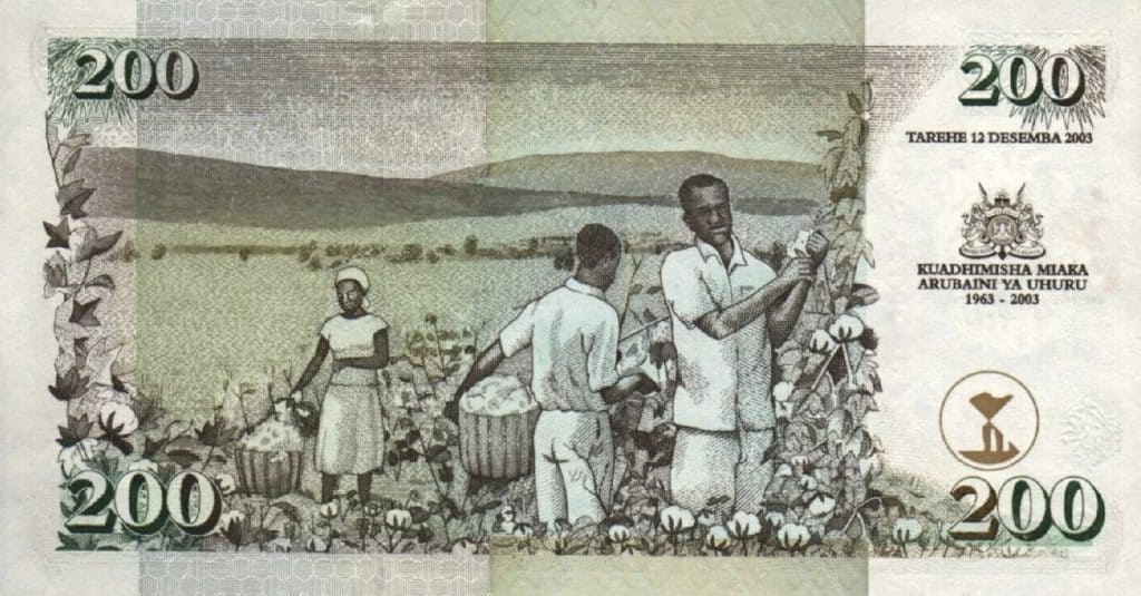 On the reverse, the banknote depicts a vivid scene of three individuals harvesting cotton, set against a backdrop of rolling hills. This imagery highlights the importance of agriculture, particularly cotton farming, in Kenya’s economy and underscores the nation’s commitment to labor and industry. The date “12 December 2003” is inscribed, marking the exact 40th anniversary of independence. The text “Kuadhimisha Miaka Arobaini ya Uhuru” translates to “Celebrating Forty Years of Independence,” further emphasizing the commemorative nature of the note.