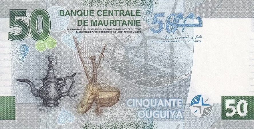On the reverse, the banknote celebrates Mauritanian culture and progress. It depicts a traditional metal tea pot, symbolizing hospitality; musical instruments, representing the rich artistic traditions; and modern wind turbines and solar panels, reflecting the country’s commitment to renewable energy and sustainable development.