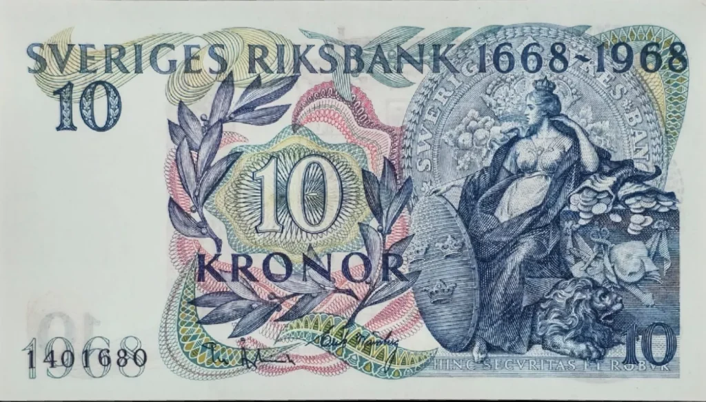 In 1968, the Sweden 10 Kronor commemorative banknote was issued to celebrate the 300th anniversary of Sveriges Riksbank, the central bank of Sweden, founded in 1668. This was a special issue distinct from regular circulation banknotes and was one of the first commemorative banknotes released by the Swedish central bank. The design reflected Sweden’s rich banking history, emphasizing the legacy and role of Sveriges Riksbank in shaping the nation’s financial system.