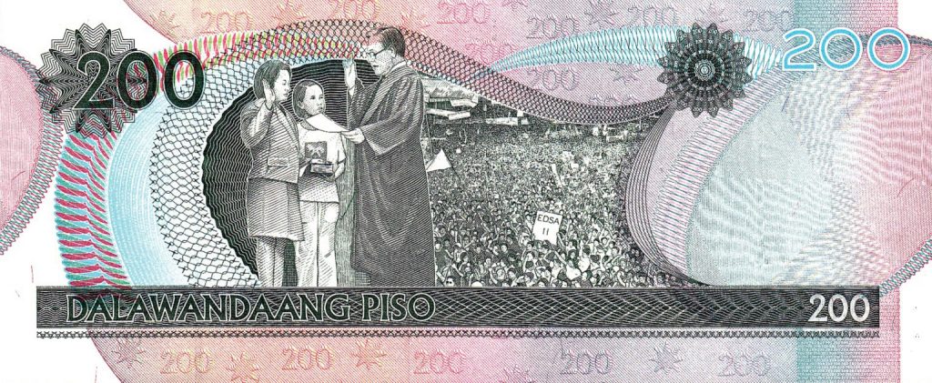 The reverse presents a historically charged tableau: Gloria Macapagal-Arroyo being sworn in as president in January 2001, her hand placed on a Bible held by Cecilia Paz Razon Abad, with Chief Justice Hilario Davide Jr. administering the oath. A dense crowd fills the background, banners raised, situating the scene within a moment of civic mobilization. The composition balances figural clarity with mass movement, a hallmark of narrative engraving adapted to banknote scale.