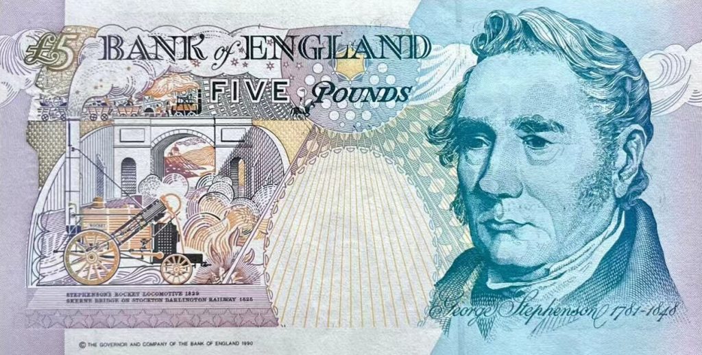 • The back side maintains a soft blue and yellow color palette, highlighting George Stephenson’s legacy.