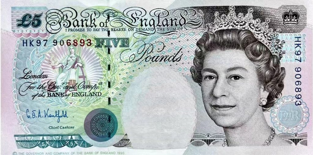 • Denomination (“Five Pounds”) – Clearly printed in large letters.